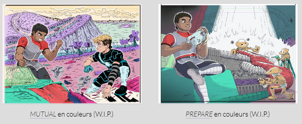 C’est un entraînement à la coloration à moindre frais, puisque les aplats sont déjà fait pour les trames existantes, et le résultat me plaît bien pour certaines. Du coup je réfléchis à les intégrer à l’artbook, mais colorer 32 artworks n’est pas non plus ma priorité, donc on verra si j’aurai le temps de tout faire, et si c’est vraiment pertinent de trouver une cohérence dans ces couleurs singulières, sachant que j’imagine ce projet en noir et blanc. Cela pose aussi la question de les proposer ou pas en print en version couleur lorsque la boutique sera disponible ? Si cela vous intéresse, faite-le savoir !