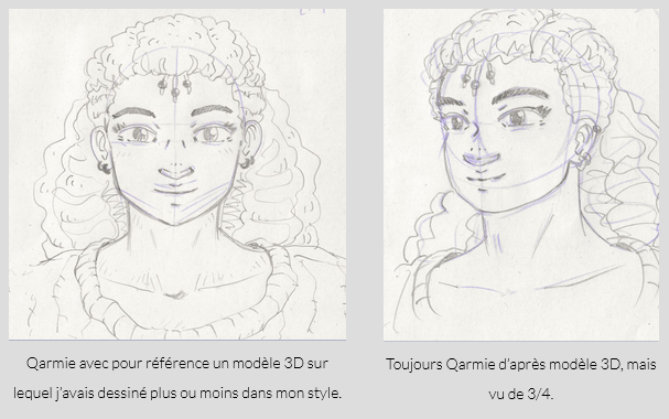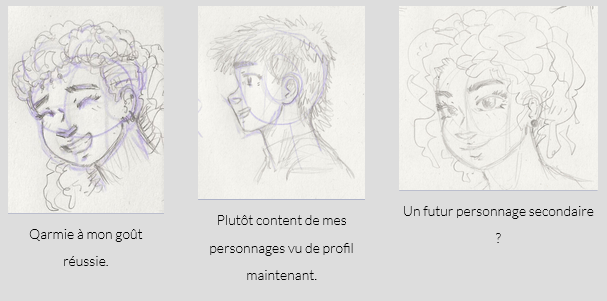 Dans mon “obsession” du moment, j’ai donc testé diverses techniques pour arriver à être consistant dans mes visages, mais malgré tous ces essais, je ne pense toujours pas avoir trouvé la méthode de lignes de construction qui me convient en terme de régularité du résultat et en fonction des angles ; il faut maintenant que j’arrive a mieux croiser ce que peuvent m’apporter les divers type de références (photo, figurine, modèle 3D, etc). Cependant, c’est ça de gagné, j’ai déjà constaté que suite à toute cette pile de feuilles remplies, il est devenu rare que je fasse des visages ratés une fois mis en miroir, même s’il n’ont pas le look recherché à la base ^^