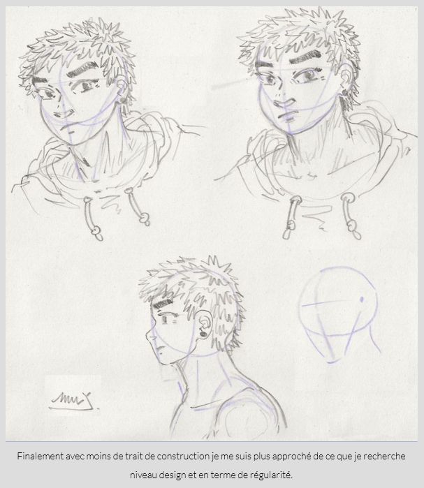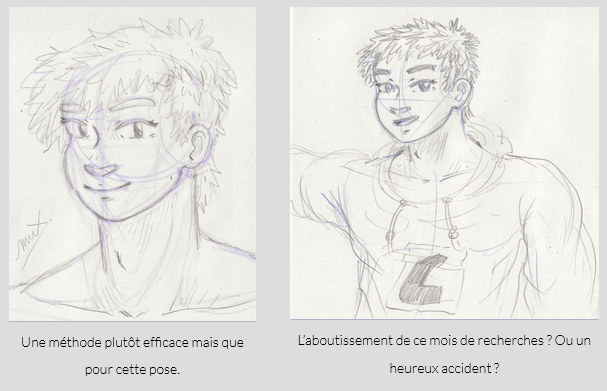 J’ai quand même eu au fil du temps les meilleurs résultats en retirant des traits de construction et en réfléchissant plutôt à l’expression en premier, en plaçant les éléments du visages par rapport aux autres avec des “indices” de distance et de positions que j’ai fini par intégrer à force de dessiner répétitivement, sans avoir besoin de les matérialiser par des lignes. Bref, pas de magie, j’ai dû déconstruire pour mieux construire, et surtout pratiquer ^^’