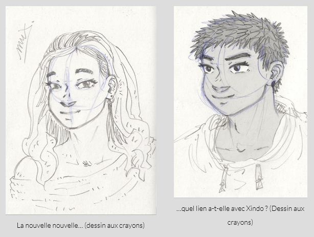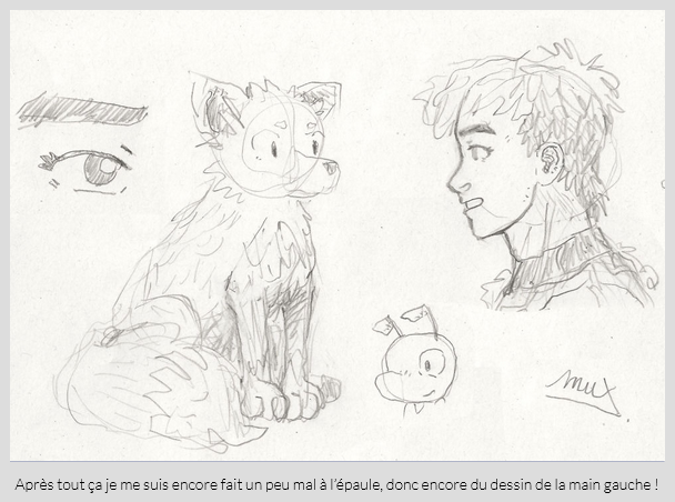 Toujours dans le détaillage des lieux, j’ai aussi ébauché un plan du repère isolé de Yammah, en me basant sur le décor d’une illustration de Weekl’iNK, avec notamment un espace entraînement, la maison, l’atelier de Dynnah (avant qu’elle ne parte) et la jolie cascade. Ce qui m’a ensuite donné de quoi faire un croquis pour une des idées d’artworks avec Dyn et Yammah, car j’avais auparavant ébauché, en tout petit sur une feuille que j’ai quadrillé, une bonne quinzaine de situations que j’avais listé il y a des mois comme potentielles illustrations pour le book (je vous montre pas tout pour le moment, c’est un secret pour tout le monde).