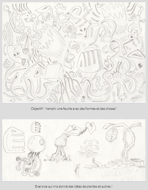 Mais c’est pas fini, puisque j’ai aussi trouvé des noms et designé deux nouveaux persos secondaires importants dans le passé de Juba (que vous pourrez voir en situation à peu près dans… 1000 ans ? Haha) des jumeaux frère et sœur, mais aussi un personnage féminin qui est liée à Qarmie et Xindo (indépendamment puisque ils se détestent cordialement par rapport à Rev) ; un perso que j’ai d’abord dessiné puis me suis demandé où je pourrais l’intégrer (parfois je fais l’inverse). Terminons aussi avec la création de nouvelles plantes bizarres, suite au remplissage “stylistique” d’une feuille A4, et même d’un logo qui n’a encore aucune utilité !
