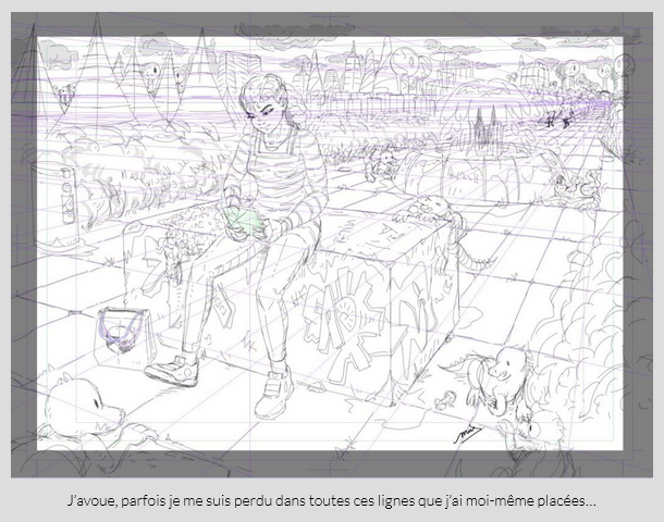 Pour corriger la perspective du croquis, faite un peu au jugé, j’ai utilisé et tenté d’apprivoiser (je crois pour la première fois) l’outil de règles de perspective de Clip Studio, qui permet de placer des lignes guide vers les points de fuite (et même aligner automatiquement les traits dessus, mais je cherche pas un rendu de dessin d’architecte donc je m’en passe). Ce qui m’a permis de vous offrir ce magnifique dallage au sol… J’aimerais bien avoir cet outil sur papier, c’est quand même très pratique quand un point de fuite est très loin hors de la feuille !