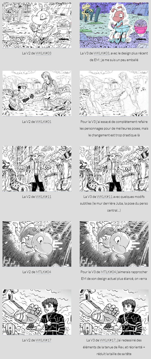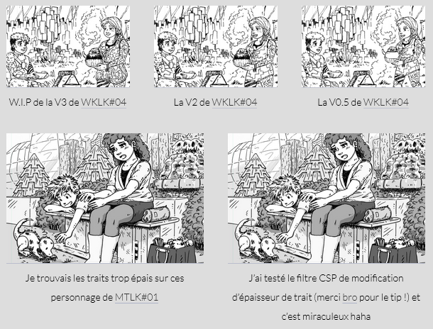 En ajoutant à ça des corrections anatomiques et au décor, ou appliquer le redesign de certains persos, puis réadapter les trames (et parfois tester en couleurs), c’est looong. Rendre intelligible mes vieux fichiers, avec leur multitude de calques incompréhensibles, m’a aussi pris des heures (j’ai mis du temps à me fixer sur à peu près le même système de dossier, de trames ou de nommage), ce qui ne m’empêche pas de continuer a faire 15000 calques pour apporter les nouvelles modifications (heureusement y’aura pas de quatrième version, hihi). Bref, ça avance en pagaille, mais ça va le faire, hein ! Aurai-je terminé fin mars ?