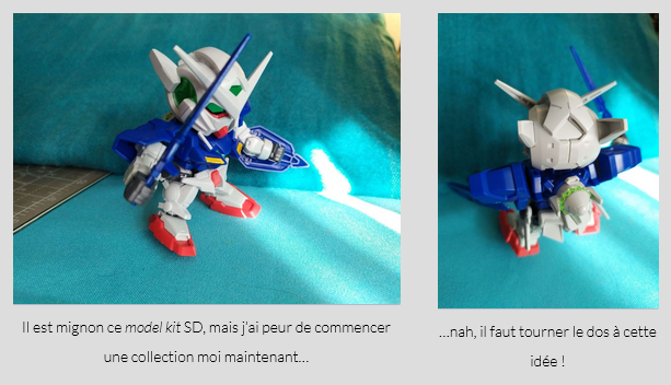 J’ai enfin assemblé (en stream) un gunpla que j’avais pris l’été dernier, le plus facile des deux (le SD), pour m’aider à dessiner K-008… et c’était finalement pas si compliqué ! Un peu plus long que je pensais tout de même, mais il fallait s’y attendre avec ma prudence habituelle pour ne pas commettre l’irréparable, mais c’était plutôt un moment relax une fois compris le système (à part les autocollants compliqués à poser, avec mon impression de voir double de près toujours présente ; j’ai toujours pas changé mes lunettes).