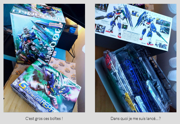 J’ai jeté mon dévolu sur une des inspirations principales de mon personnage, à savoir le Gundam GNT-0000 00 Qan[T] (*atchoooooou*) dans sa version MG “pour Master Grade” (faisant une vingtaine de centimètres). L’autre inspiration, peut-être plus flagrante est celle du Gundam Exia, dont est dérivé le précédent, que j’ai pris en version SD GN-001REII Gundam Exia Repair II toute mignonne ; d’une parce que ça coûte moins cher qu’un amiibo, deuzio pour me faire la main étant donné que je n’ai jamais monté de gunpla, et troizio il aura une grosse tête bien lisible en tant que référence de dessin. L’autre inspi majeure, puisqu’on en parle, n’est pas un mecha mais un cyborg, soit Mighty Gazelle des jeux F-Zero, qui pilote mon vaisseau préféré. Le real deal serait de prendre la version PG de 30cm (Perfect Grade), du Exia que j’avais vu dans un magasin parisien, mais le prix est vraiment beaucoup plus élevé (~200€) et puis… serai-je capable de monter ce puzzle ? Peut-être que le mois prochain vous n’aurez que des dessins de robots, ahah !