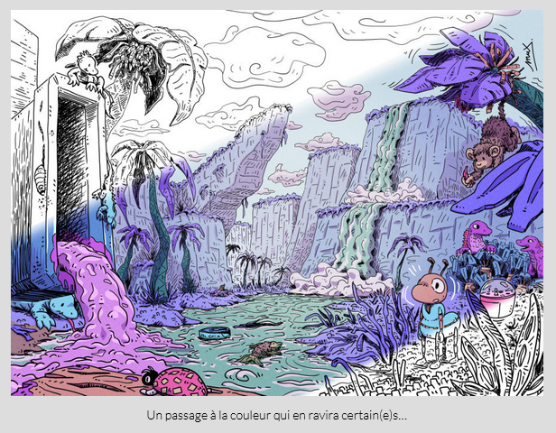 Cette illu était une candidate idéale, avec tout ses petits éléments et détails, pour étudier et ajouter des techniques du tutorial vidéo de Bryce Kho concernant la coloration, dont je vous parlais il y a deux mois. Ayant déjà mes habitudes, même si je fais rarement de couleur, comme une bonne partie du chemin est identique à ma façon de faire les trames de ma série d’illustrations de la “phase I”, je n’ai pas suivi sa méthode de A à Z, en gardant par exemple mon fonctionnement d’un unique calque pour tous les aplats (au lieu d’un layer par couleur), j’ai gardé le principal, c’est-à-dire partir des couleurs claires jusqu’aux plus foncées, réutiliser la même couleur pour plusieurs éléments de manière homogène dans le dessin (même si ce n’est pas leur teinte “réelle”), mais aussi comment choisir les couleurs au fur et à mesure. J’ai ensuite ajouté les ombres et quelques “highlights” (principalement des reflets lumineux), et terminé avec un filtre de couleur général pour rendre le tout harmonieux, sans oublier le petit perlin noise des familles pour apporter de la texture. Cette méthode a plutôt été efficace, même si par moment moins fluide que ma façon de fonctionner d’origine, car ça me fait plus de choses à prendre en compte au fur et à mesure, et que je n’ai évidemment pas encore d’automatismes.