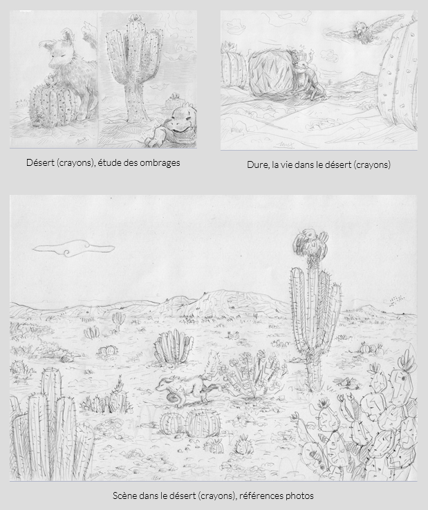 J’avais envie d’explorer des paysages pas encore vus dans Distortion, je me suis donc penché sur le désert, plutôt inspiré de ceux de la frontière Mexique / États-Unis, en faisant quelques petits dessins de la faune et la flore. Ça ne veut pas dire que le jour où un désert apparaîtra dans un truc considéré comme “canon” cela ressemblera exactement à ce que j’ai fais dans ces croquis, mais en voilà déjà un aperçu après quelques simples études ! Comme toujours j’ai “angularisé” le réel, placé des motifs récurrents, et adapté quelques bestioles, tel un rapace, un reptile ou un gros coléoptère… Le petit renard “à sabots” n’est bien entendu aucunement influencé par mon ami toutou pot de colle.