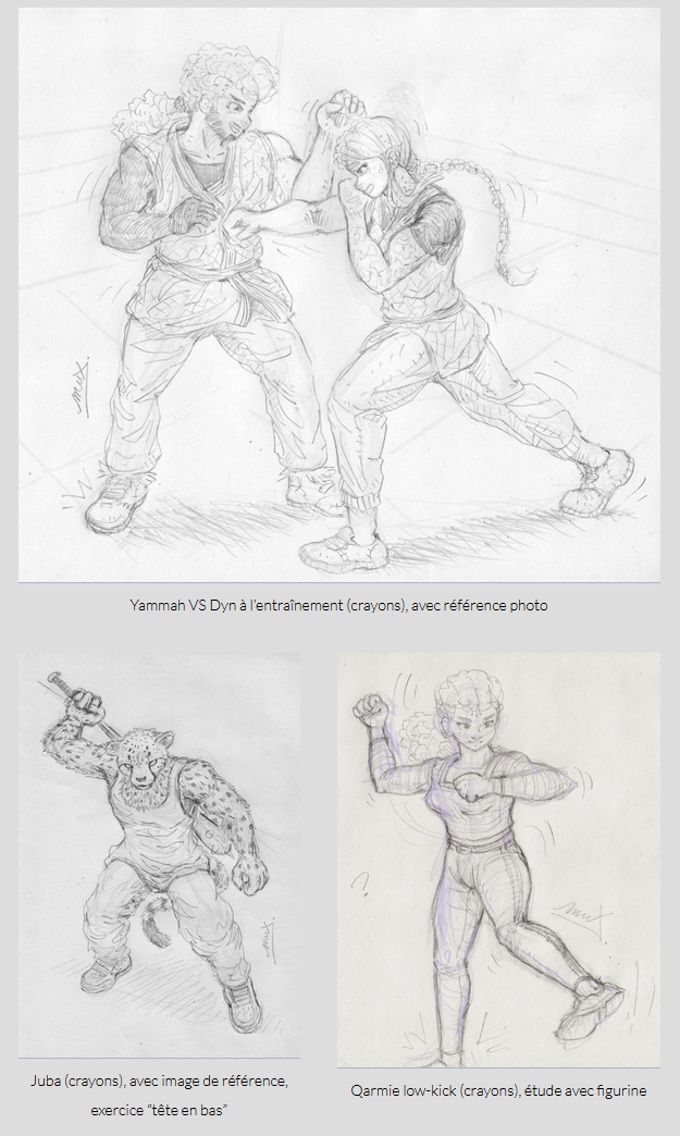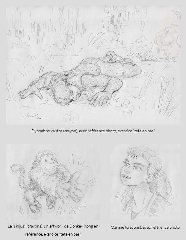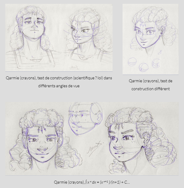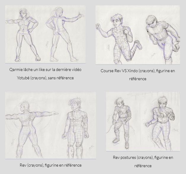 Je suis aussi reparti dans ma quête d’arriver à dessiner plus aisément mes personnages sous tous les angles en m’aidant de traits de construction “savamment” pensés, n’étant pas totalement convaincu de la méthode que j’ai trouvée par moi-même depuis l’année dernière qui ne fonctionne pas idéalement sur pas mal de positions (difficile de réinventer la roue). En réfléchissant davantage et intégrant aussi quelques techniques vues par ci par là (ne vous étonnez pas de voir des dessins de mes persos aux styles peu familiers) j’arrive à de meilleurs résultats, mais seule la pratique dira si c’est suffisant ou si je dois modifier la méthode. Le but étant toujours d’arriver à coller au style graphique que j’ai développé jusqu’à présent dans mes illustrations, qui a gardé une certaine uniformité en “bricolant”, et donc pas souvent naturellement sans prendre d’anciens dessins en référence.