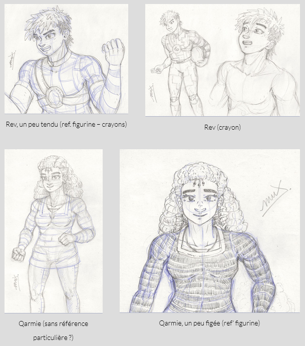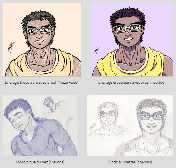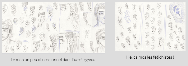 Deux lubies passagères sinon : j’en avais pas fait depuis longtemps, donc m’améliorer pour dessiner des lunettes, ce qui est vite source de problèmes quand elle sont un peu détaillées, avec des défauts de proportions qui sautent vite aux yeux, ou masquent les expressions du visage ; et ensuite, percer le mystère des oreilles (lol), que j’ai longtemps fait très simples, et ensuite vite fait plus détaillées, mais que récemment je trouvais inégales dans la perspective selon le point de vue sur les personnages, avec parfois un côté très “plat”. Je suis toujours pas convaincu par ce que je fais, mais j’ai pas encore craqué et regardé de tutos, juste étudié des photos et modèles 3D ! J’ai ajouté ça dans la rotation de mon planning d’exercices, alors tout peut arriver…