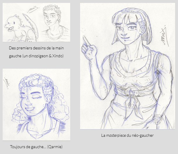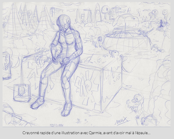Mais impossible de rester à rien faire sans dessiner, j’ai donc tenté d’utiliser mon bras gauche, chose que j’ai très jeune entraîné de temps en temps, au cas où ; utilité confirmée le jour ou mon père avait eu son AVC et son bras dominant HS pour toujours ; mais pour le coup ça faisait longtemps que je n'avais pas pratiqué. Bah… franchement j’ai plutôt été surpris ! Ça demande beaucoup plus de concentration, et maîtriser le trait du crayon reste une épreuve, mais j’arrive à m’approcher au moins structurellement de ce que je dessine avec ma main droite. Un skill utile qu’il faut continuer à exercer ^^’