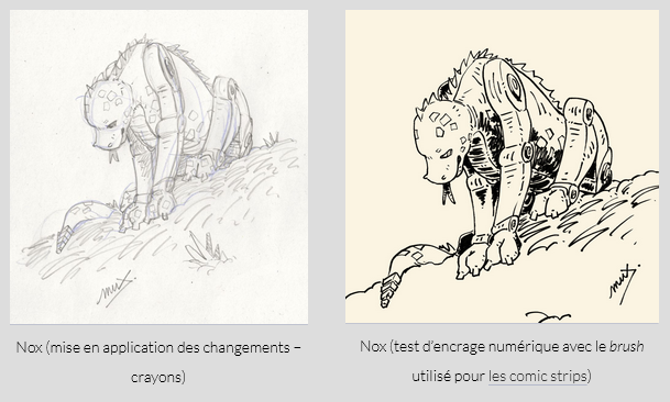 Une réflexion sur l’apparence de Nox, et le fait de galérer à dessiner ses membres mécaniques dans la perspective (le côté “raide” demande à être exact sous peine de paraître tout de suite faux), m’a amené à réfléchir à repenser un peu son apparence, en remodelant ses membres pour leur donner une forme plus proche de muscles, pour un meilleur dynamisme et une once de latitude dans le flou artistique. Et aussi rajouté des motifs carré sur ses patounes un peu simples.
