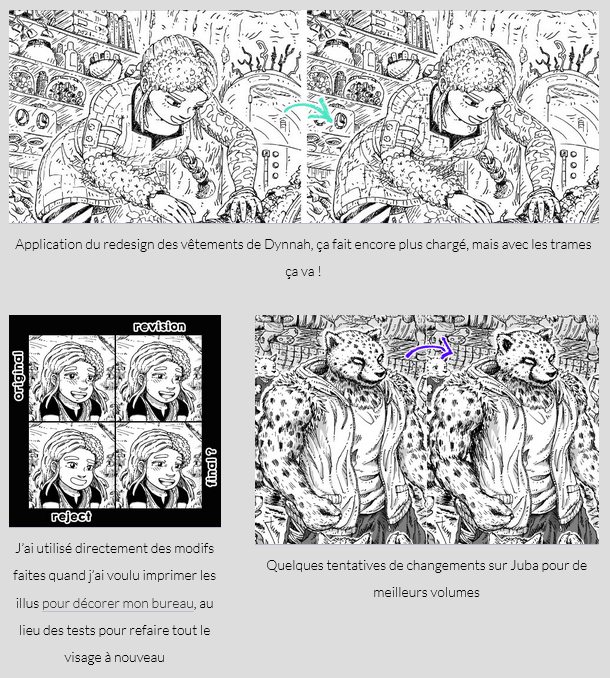 Déterminé à enfin avancer sur la boutique, je me suis mis comme petit objectif initial d’en finir avec les retouches des illustrations de 2023 et 2024 d’ici fin février, sachant que toutes n’auront pas besoin d’efforts équivalents afin de devenir du print material. J’ai tenté au départ d’appliquer en pagaille quelques “retcons”, certains dont je vous avais déjà parlé l’année dernière, comme les fringues de Dyn et le design de Nox en particulier. Le plus dur en fait est de savoir s’arrêter, j’ai parfois passé une heure ou deux à faire des modifications, mais pour un résultat peu harmonieux avec les parties existantes du dessin qui ne bougeront pas, et donc finalement rétropédalé pour retirer des détails. Parfois j’ai voulu drastiquement refaire des visages, avec mon “chara design” actuel, pour là encore un résultat à côté de la plaque, n’arrivant pas à bien adapter la nouvelle partie avec ce qui l’entoure (comme la Dyn enfant).